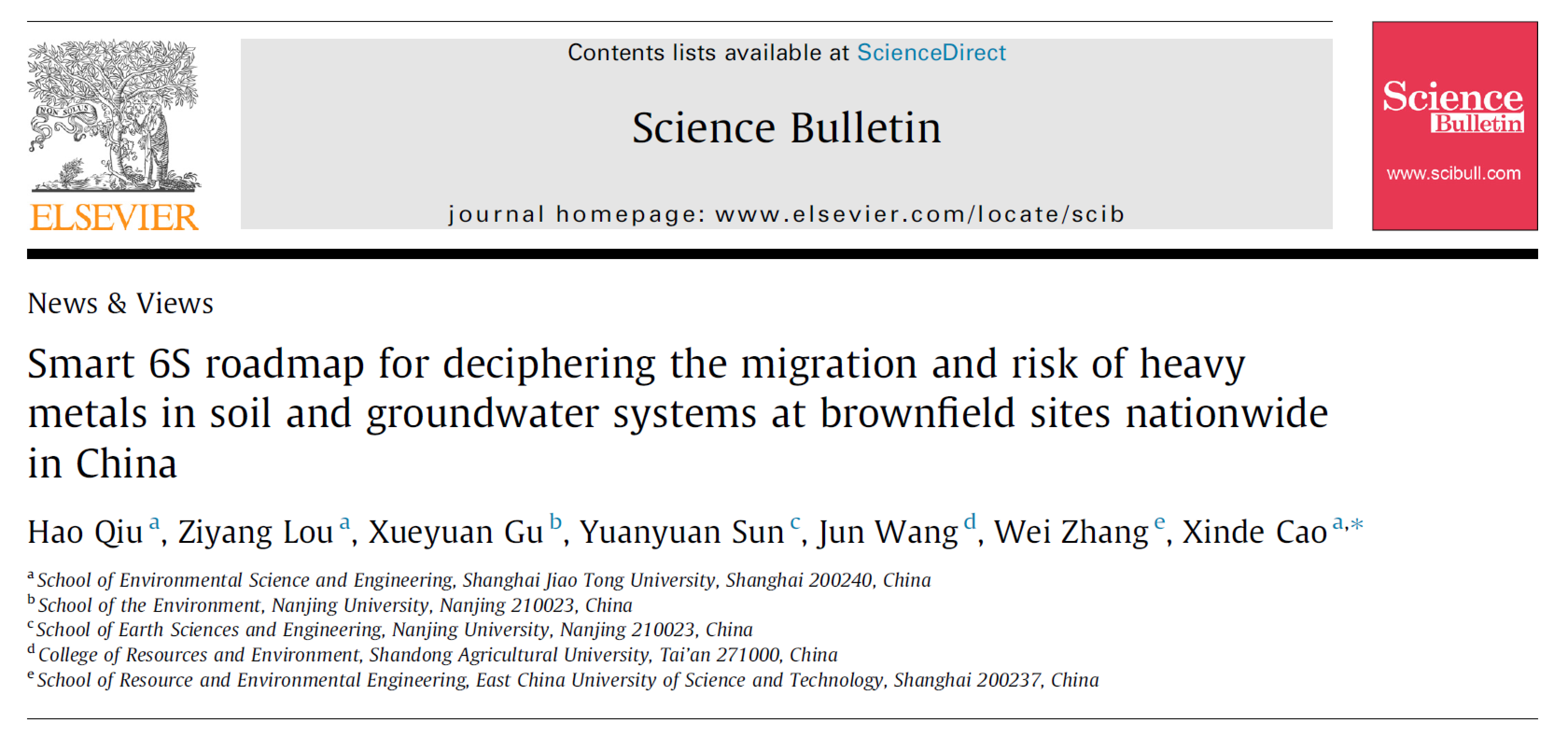 近期,韩国av 土壤与地下水污染修复技术团队(曹心德教授团队)在综合性Top期刊Science Bulletin发表了题为《Smart 6S roadmap for deciphering the migration and risk of heavy metals in soil and groundwater systems at brownfield sites nationwide in China》的视点文章。团队领衔与国内有关专家合作,开创性地提出了智慧6S路线图,并基于此破译了我国代表性区域城市工业污染场地土壤和地下水系统中重金属迁移扩散潜势与风险。