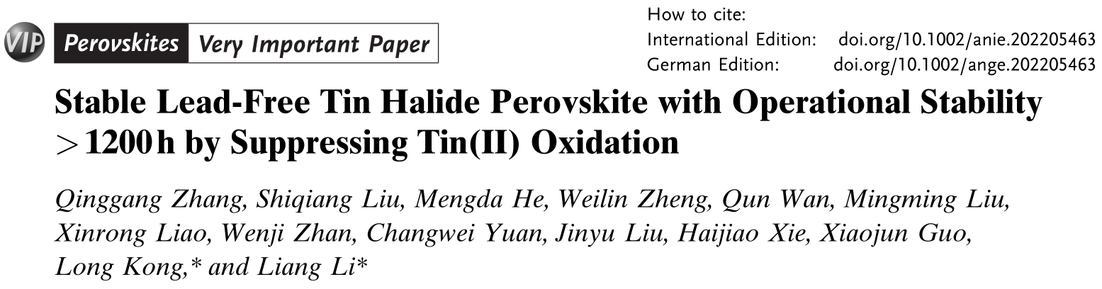 1. Zhang Q, Liu S, He M, et al. Stable Lead‐free Tin Halide Perovskite with Operational Stability> 1200 h by Suppressing Tin (II) Oxidation[J]. Angewandte Chemie International Edition, 2022.