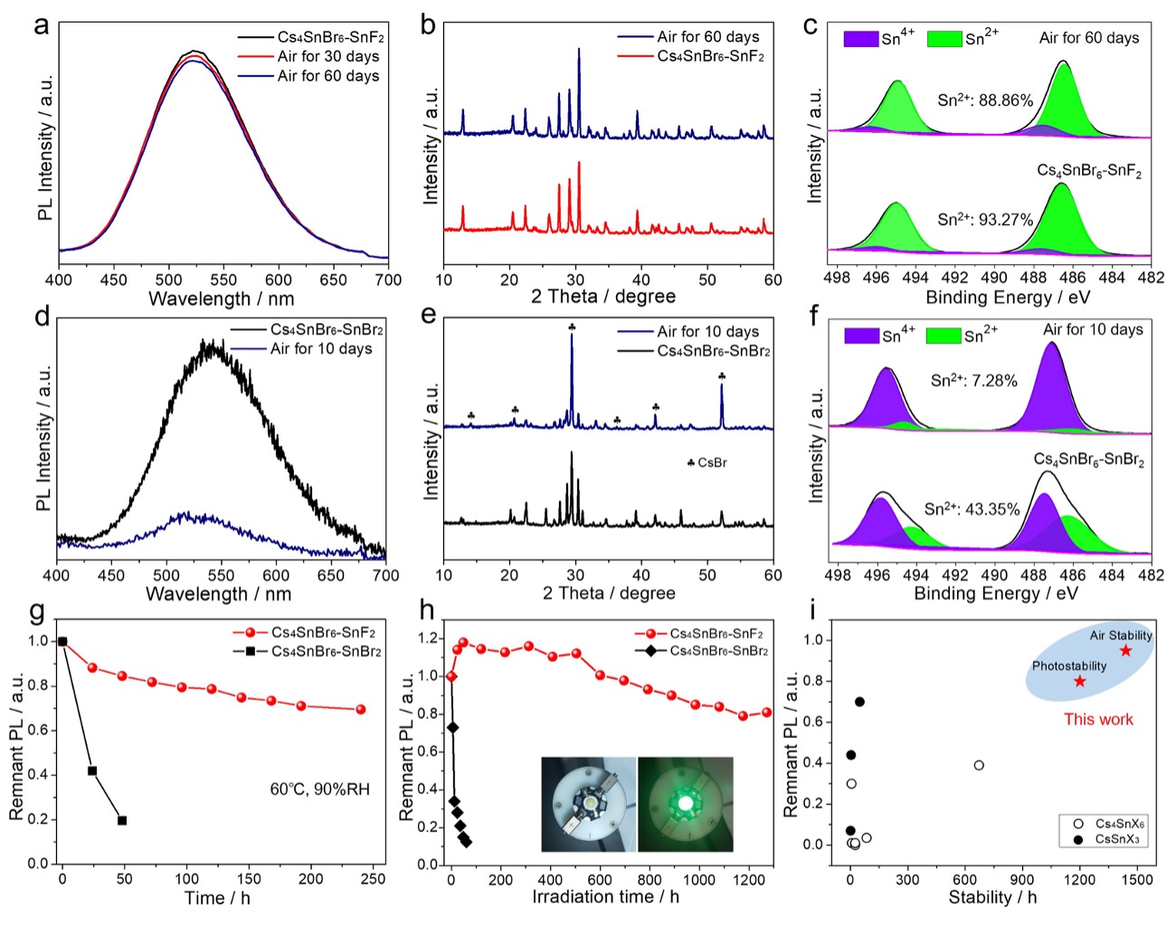 本研究报道了一种简单的合成策略,即以SnF2作为锡源,替换了传统易氧化的SnBr2,制备了高效稳定的无铅Cs4SnBr6钙钛矿材料。F-离子的引入构建了富氟的微环境,不仅有效地抑制了合成过程中Sn2+的氧化,而且形成了化学稳定的Sn-F配位,在长期运行过程中,能有效阻止电子从Sn2+向氧气分子的转移。SnF2衍生的Cs4SnBr6钙钛矿显示出62.8%的荧光量子产率,并且在1200小时内对氧气、水分和紫外光辐射具有出色的稳定性,是最稳定的无铅钙钛矿之一。该结果为提高无铅钙钛矿的光学性能和稳定性提供了一条新思路。