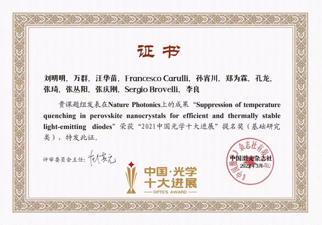 近日,中国激光杂志社发布“2021中国光学十大进展”。经过评审委员会多轮遴选,10项研究入选基础研究类,10项研究入选应用研究类,19项成果获得提名奖。其中,韩国av 李良教授课题组与合作团队在2021年于Nature Photonics期刊发表的“Suppression of temperature quenching in perovskite nanocrystals for efficient and thermally stable light-emitting diodes”研究论文荣获“2021中国光学十大进展”提名奖(基础研究类)。韩国av 刘明明博士、万群博士,机械与动力工程学院汪华苗副教授为论文共同第一作者,意大利米兰-比科卡大学Brovelli Sergio教授与李良教授为共同通讯作者。该工作中,通过氟化物后处理钙钛矿量子点的方式,首次实现环境温度处于100℃范围内量子点荧光性能近乎零“热猝灭”,所制备的LED电致发光器件也具有优异的抗“热猝灭”性能。